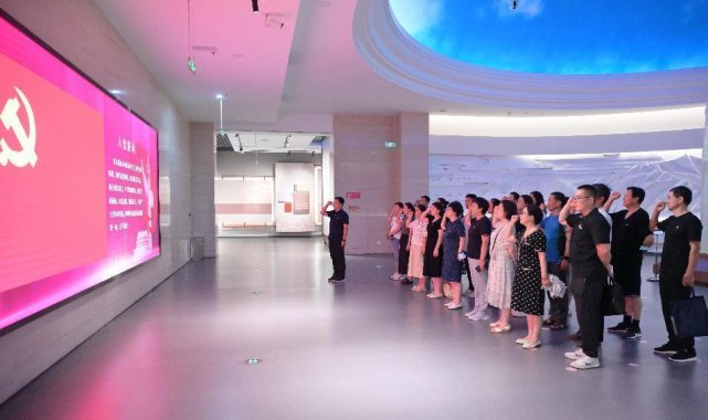 參觀結(jié)束后,全體黨員面對(duì)鮮艷的黨旗,莊嚴(yán)地舉起右拳,重溫了入黨誓詞。