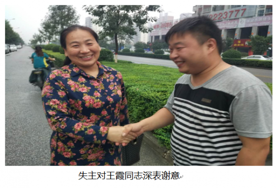 王霞同志是市供銷社安全統籌辦的工作人員。9月23日晚7時許,家住鐵路東藥廠家屬院的王霞同志吃罷晚飯后,和往常一樣在練江大道上散步,走著走著,突然發現一個棕黑色的錢包映入眼簾。王霞同志撿起來打開錢包一看,內裝有身份證、三張銀行卡和372元現金等物品,她立即在周圍打聽尋找失主,等到晚上九點多鐘,仍不見失主身影。通過包內身份證她得知失主是一位驛城區水屯鎮王坡村的90后小伙子,因擔心失主著急,隨即打電話、發動親朋好友通過微信群和市供銷社官方微信群等方式尋找失主,但一直杳無音信。9月26日上班,王霞同志就向單位報告事情經過,將錢包交市供銷社辦公室,并請求單位幫助尋找失主。了解到事情經過后,辦公室負責同志立即向驛城區供銷社聯系,通過水屯鎮供銷社打聽大王坡村王昊同志的信息,同時通過撥打110 上報東高派出所尋求幫助,并將錢包移交東高派出所治安大隊保管。26日中午,王昊同志通過在水屯鎮供銷社上班的親戚得知市供銷社王霞同志撿到了他的錢包后,下午三點多鐘,他趕到了市供銷社,面對失而復得的的錢包,王昊同志十分感激,他緊緊地握住王霞同志的手說:“謝謝王阿姨!謝謝市供銷社!”。