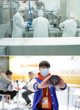 這是一張拼版照片,上圖為艾萊發喜新西蘭公司員工在冰激凌生產線上工作(資料照片,新華社發);下圖為11月7日,工作人員在第三屆進博會G'nature展臺展示從新西蘭進口的冰激凌(新華社記者 張玉薇 攝)。新華社發