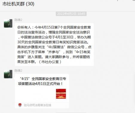 一是普及法律知識。針對當前疫情多點散發態勢,為有效控制疫情蔓延,市供銷社采取網絡渠道進行國家安全法治知識宣傳。通過在微信工作群轉發“中國普法”微信公眾號“4.15”全民國家安全教育日專項答題活動要求,動員全體人員踴躍參加,積極響應市司法局組織的普法知識競答活動,在系統上下營造維護國家安全的濃厚氛圍。